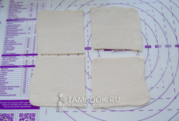 После раскатайте тесто толщиной 3-4 мм. Затем разрежьте на 4 прямоугольных пласта размером приблизительно 10х12 сантиметров.