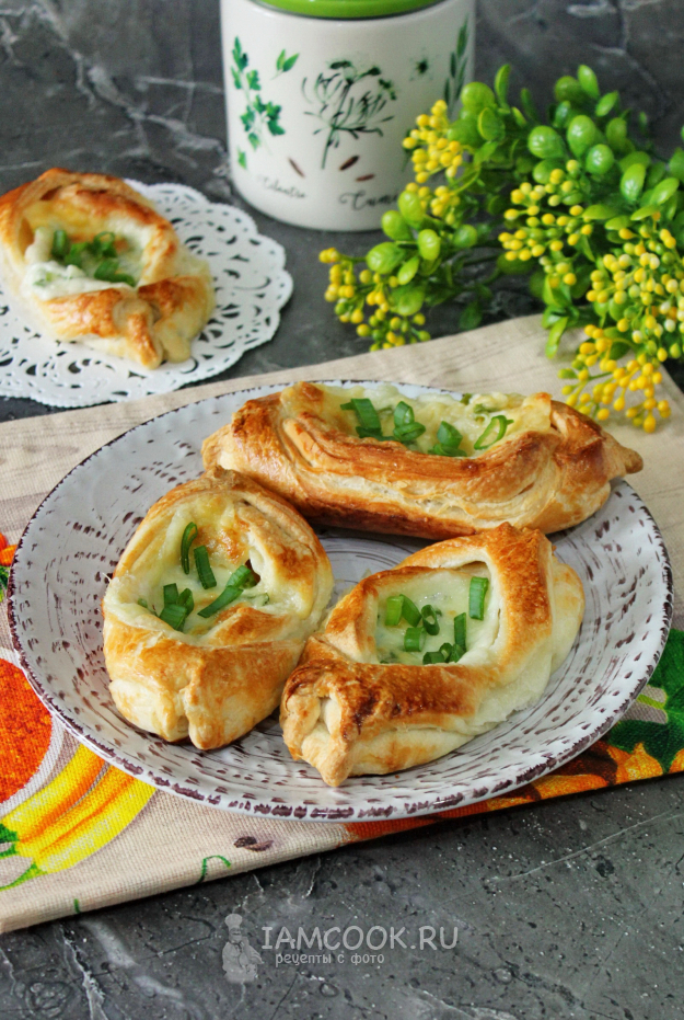 На середину пласта теста выложите 2-3 столовые ложки полутвердого сыра и нарезанный мелко зеленый лук.