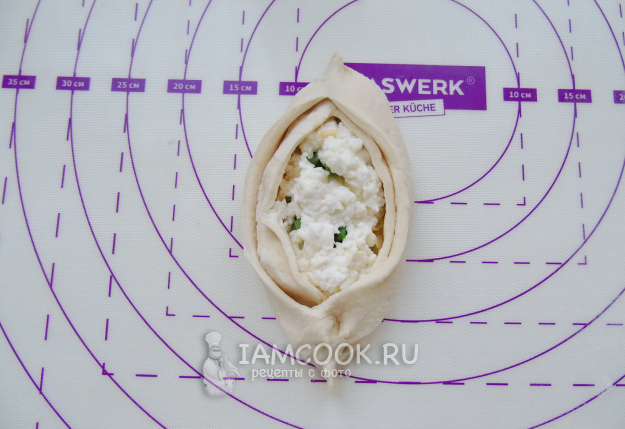 Сформируйте лодочку. Одной половиной теста накройте начинку из сыров и лука, образуя отверстие.