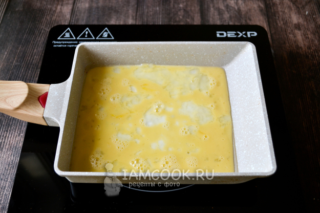 На сковороду налейте чуть-чуть масла, разогрейте, влейте яичную смесь слоем около 5 мм. Сковороду можно использовать обычную. Главное, чтобы она была с хорошим антипригарным покрытием.