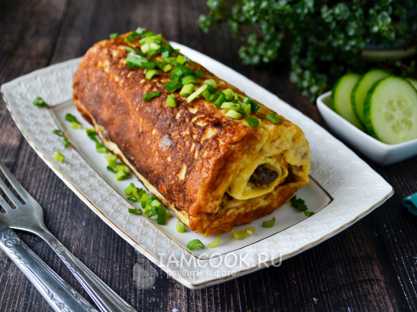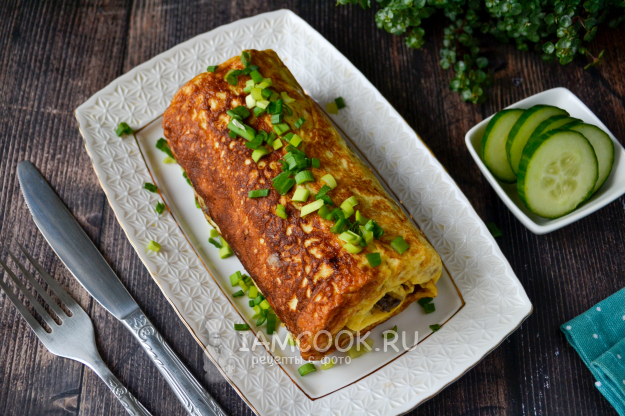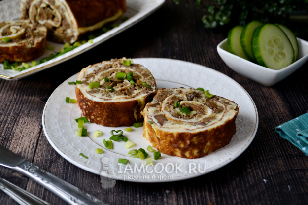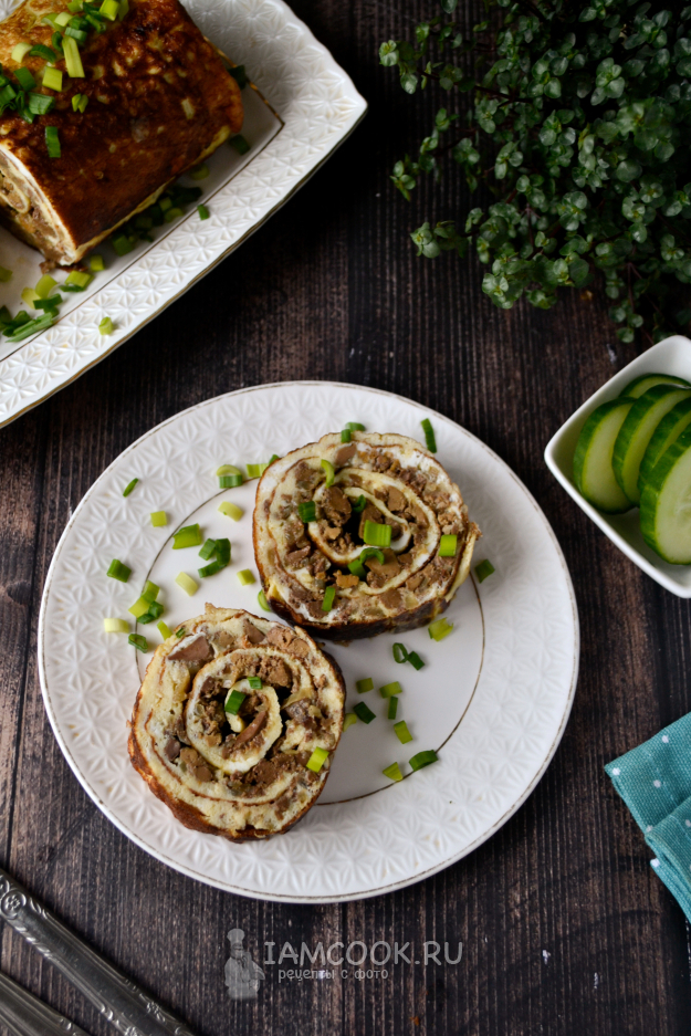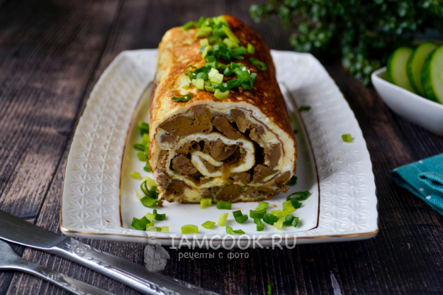 Подавайте яичный рулет с печенкой горячим, сразу со сковороды.