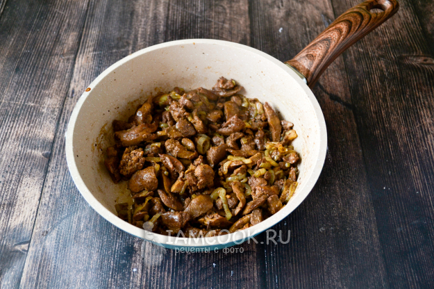 Тушите печенку с луком 15-17 минут на среднем огне, помешивая. Посолите.