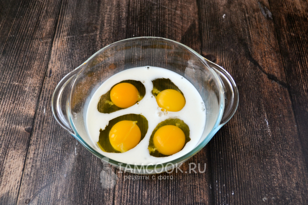 В миску разбейте яйца, посолите, влейте молоко.