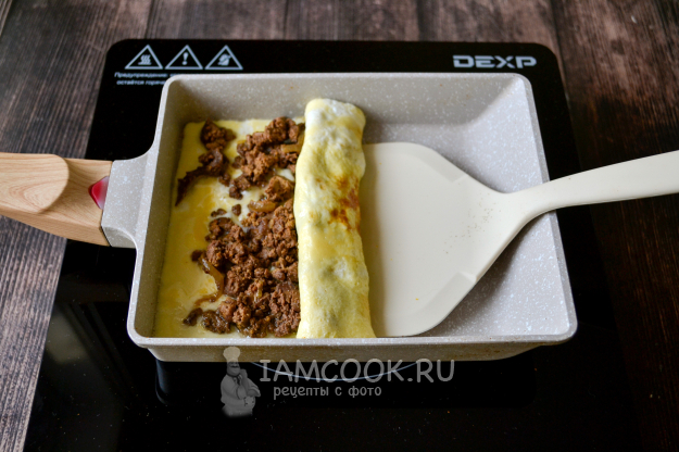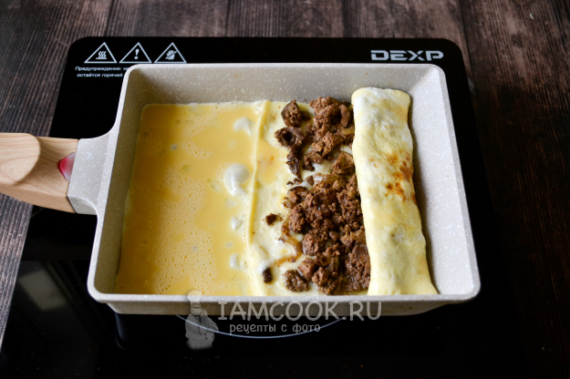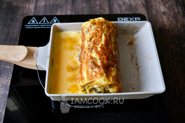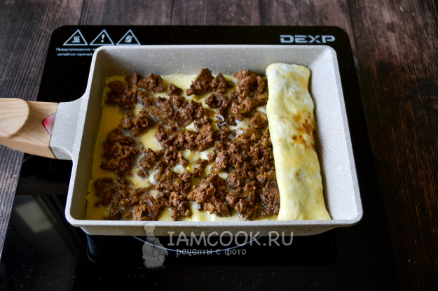 Сверните и сдвиньте на край сковороды. На освободившееся место на сковороде влейте порцию яичной массы.