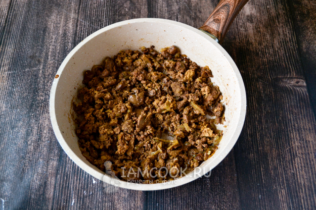 Горячую печенку разомните вилкой прямо на сковороде. Можно нарезать мелкими кусочками или воспользоваться погружным блендером.
