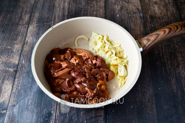 Разложите равномерно часть куриной печенки.
