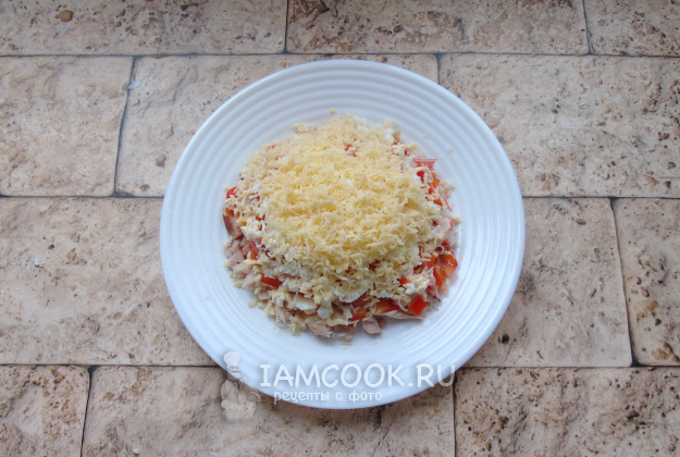 Твердый или полутвердый сыр натрите на терке и посыпьте верх салата.