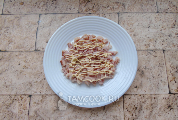 У копченой курицы удалите шкурку и кости. После нарежьте небольшими кубиками и выложите на тарелку. Покройте майонезом.
