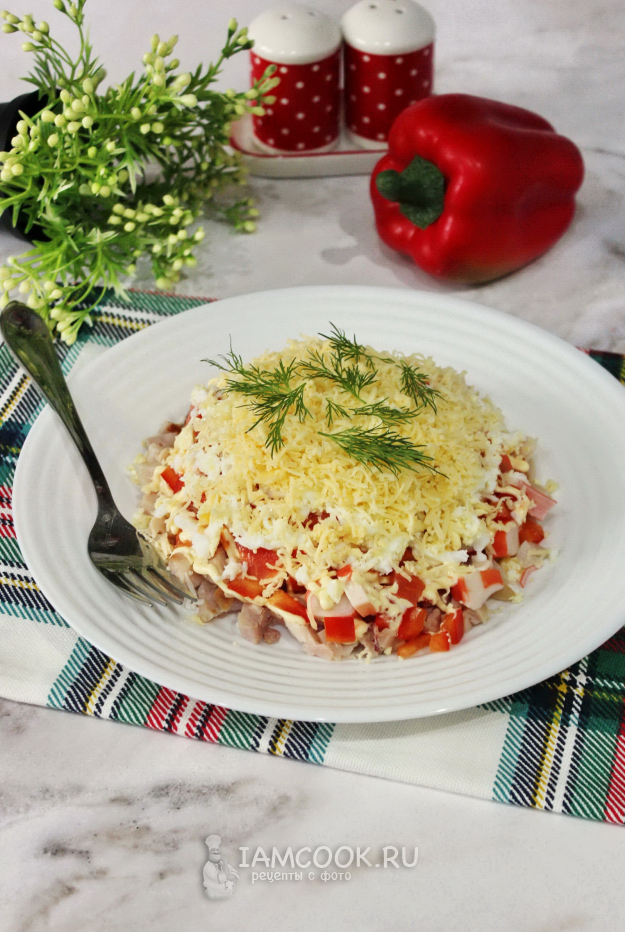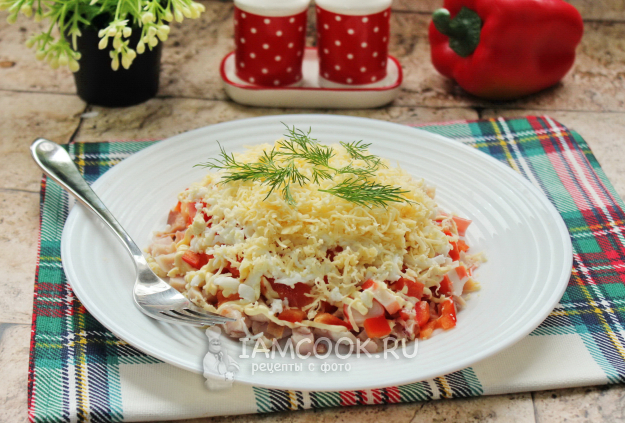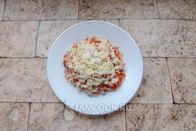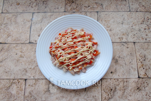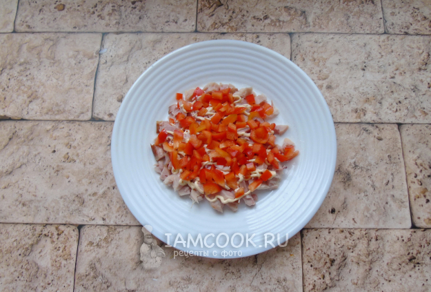 Болгарский перец очистите от семян, помойте и мелко нарежьте. Выложите вторым слоем салата.