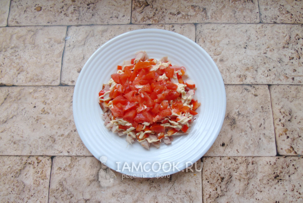 Помидор помойте и мелко нарежьте. Это будет следующий слой салата. Покройте майонезом.