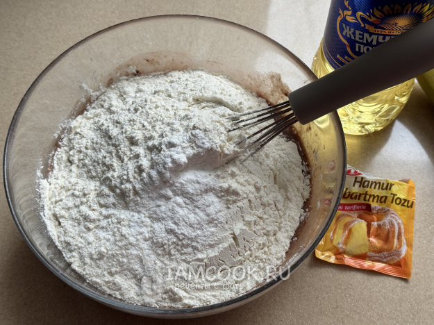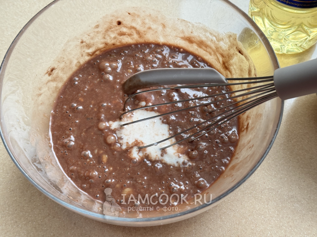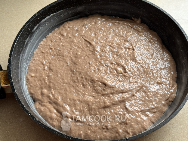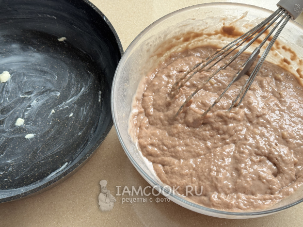 Перемешать тесто венчиком до однородного состояния. Сковороду 24 см в диаметре смазать сливочным маслом.