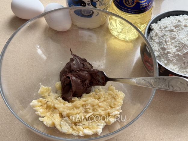 Размять банан вилкой и добавить к банану шоколадную пасту.