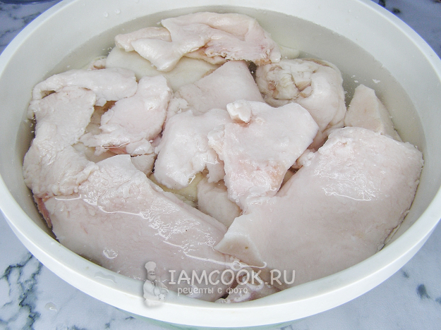 Чтобы избавиться от возможного неприятного запаха, нарезаем жир на куски и заливаем холодной водой. Оставляем на 2-3 часа, каждый час сливая использованную воду и заливая свежей.