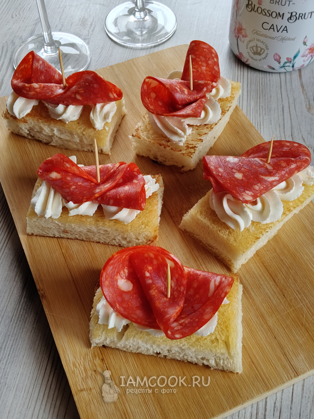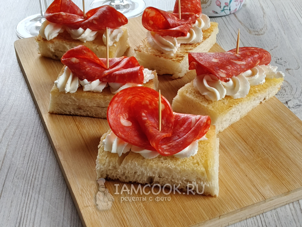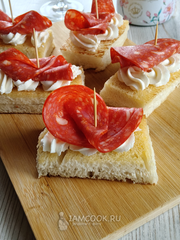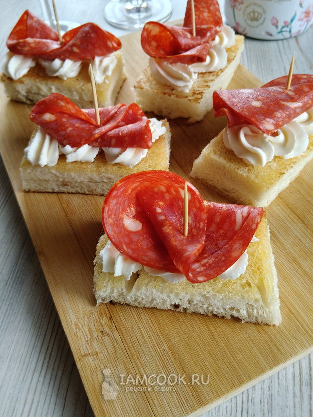 Сверху выложить колбасу. Если ломтик не держится, то можно воткнуть зубочистку.