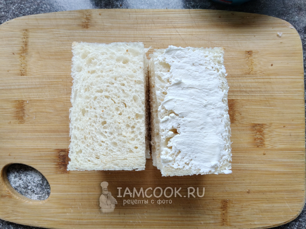 Оставшийся сыр переложить в мешок с насадкой, выложить на хлеб.