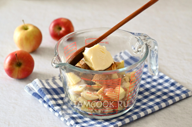 Яблочные кубики сложите в миску, добавьте сахар, корицу и мягкое сливочное масло. Всё перемешайте.