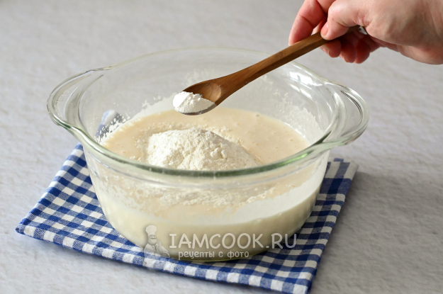 Всыпьте просеянную муку и добавьте разрыхлитель.