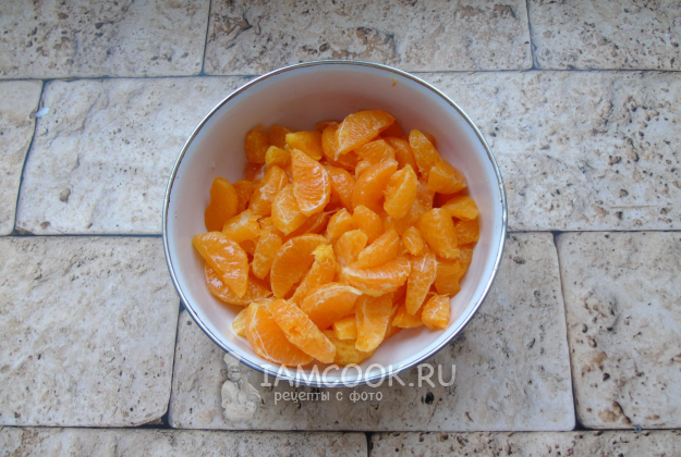 У мандаринов очистите кожуру, удалите по максимуму белые пленки и косточки, если есть.
