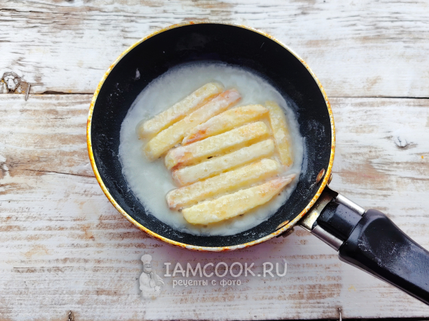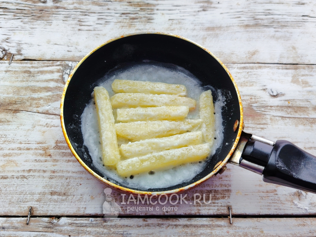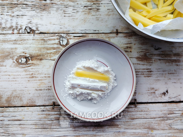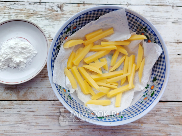 Обжарить картошку фри в кукурузном крахмале, переворачивая аккуратно кусочки лопаткой, до легкого румянца.
