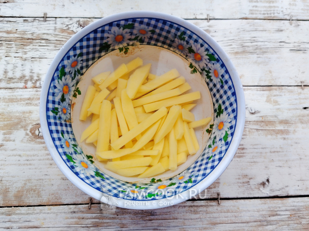 Картофель помыть, почистить и нарезать тонкими брусочками. Промыть картофельные кусочки и залить их ледяной водой, оставить на 10 минут.