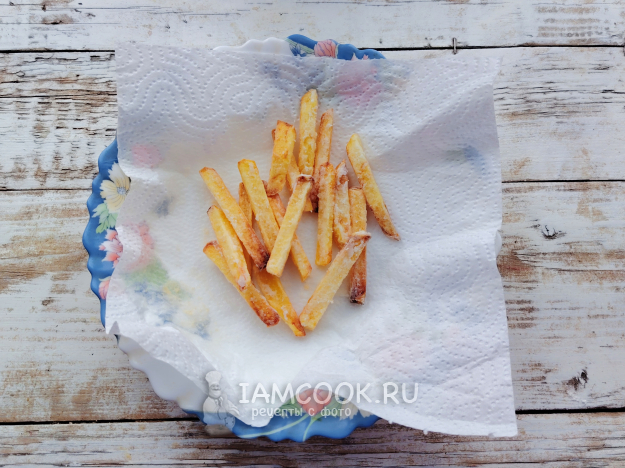 Вынуть картофель на бумажные салфетки, чтобы убрать излишки масла с поверхности картофеля.
