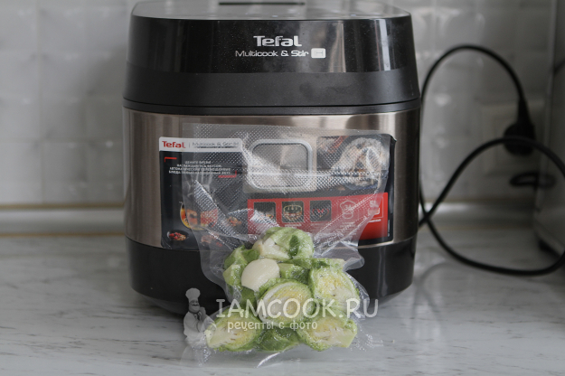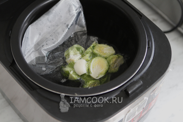 Когда вода нагрелась до нужной температуры, пакет с брюссельской капустой переложила в чашу мультиварки. Важно: пакет должен быть полностью погружен в воду. Если он будет всплывать, сверху можно установить маленький грузик.