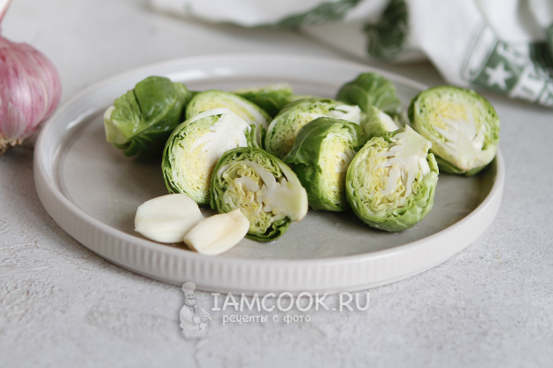 Почистите два зубчика чеснока. Капусту разрежьте пополам и по возможности срежьте кочерыжку. Дело в том, что именно кочерыжка придает горечь брюссельской капусте, поэтому ее многие и не любят.