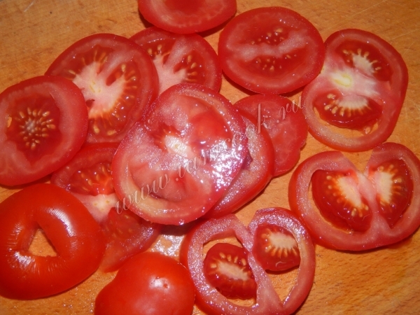 Пока жарятся кабачки - подготовим помидоры. Нарежем их тонкими кружочками, толщиной 3-4 мм.