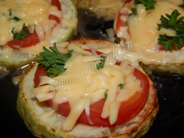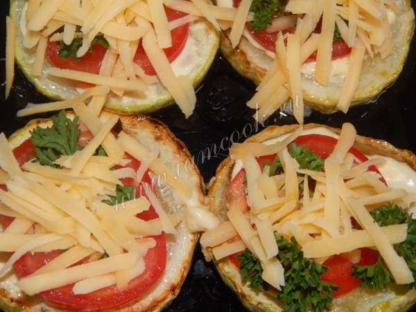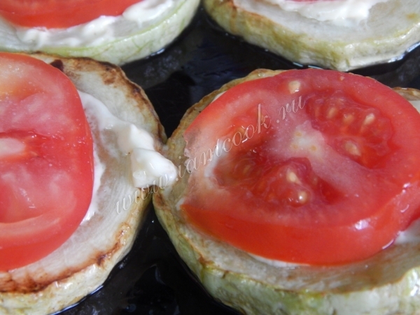 Каждый кружочек накрываем колечком помидора. Кстати, помидор можно тоже подсолить двумя-тремя крупинками соли. В том случае, если кабачки Вы не пересолили - блюдо от этого только выиграет.