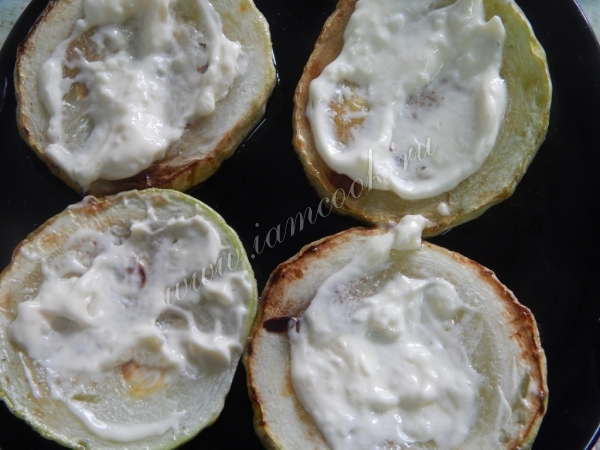 Готовые, прожаренные кабачки выкладываем на тарелку. Дожидаемся, пока они немного остынут, и промазываем каждый майонезом с чесноком.