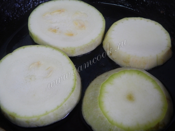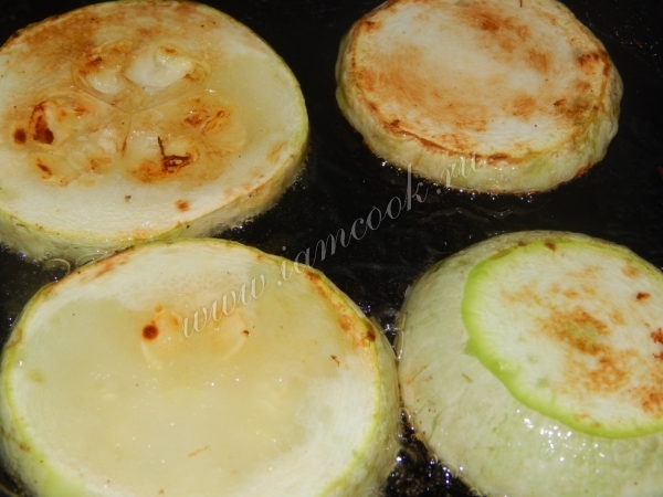 Теперь разогреваем сковороду на среднем огне, наливаем рафинированное масло. Аккуратно выкладываем кружочки кабачка, солим каждый щепоткой соли. Обжариваем с одной стороны 3-4 минуты.