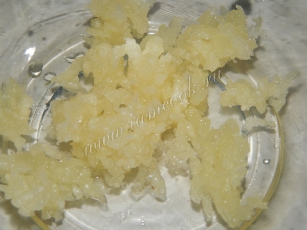 Очищенные от шелухи зубки чеснока пропускаем через пресс. С таким количеством чеснока блюдо получится достаточно пикантное, так что здесь каждая хозяйка решает на свое усмотрение.