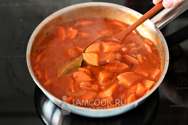 После закипания убавьте огонь до среднего и тушите всё до готовности. Морковь в томате у меня тушилась 15 минут, но лучше пробовать, так как сорта моркови разные и нарезка может быть крупнее/мельче. Крышкой лучше не накрывать, чтобы соус чуть выпарился.