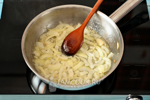 Разогрейте в сковородке растительное масло и отправьте туда лук. На довольно сильном огне поджарьте его до лёгкого золотистого цвета (3-5 минут).