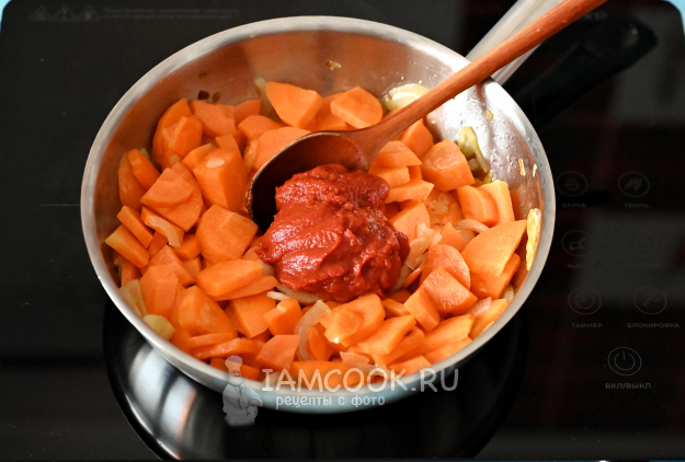 Следом добавьте в сковороду томатную пасту и продолжайте обжарку ещё примерно 1 минуту.