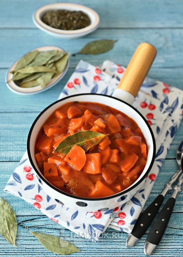 Соберите необходимые продукты для приготовления тушеной моркови в томатном соусе.