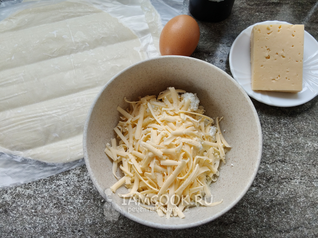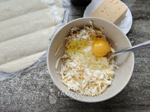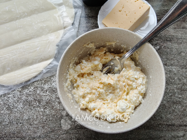 В творог натереть сыр.