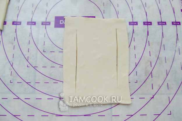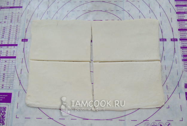 Слоеное дрожжевое тесто разморозьте и раскатайте толщиной 3-4 мм. Разрежьте на прямоугольники размером приблизительно 10х12 сантиметров.