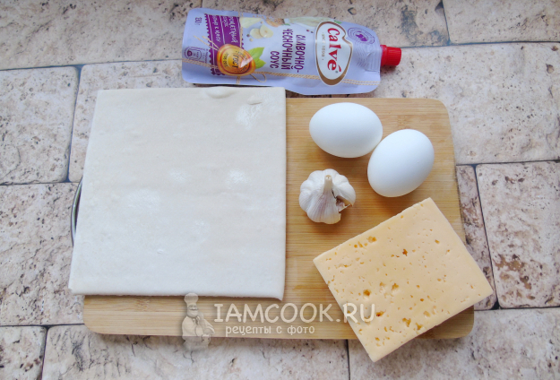 Соберите ингредиенты для приготовления лодочек из слоеного теста с яйцом.