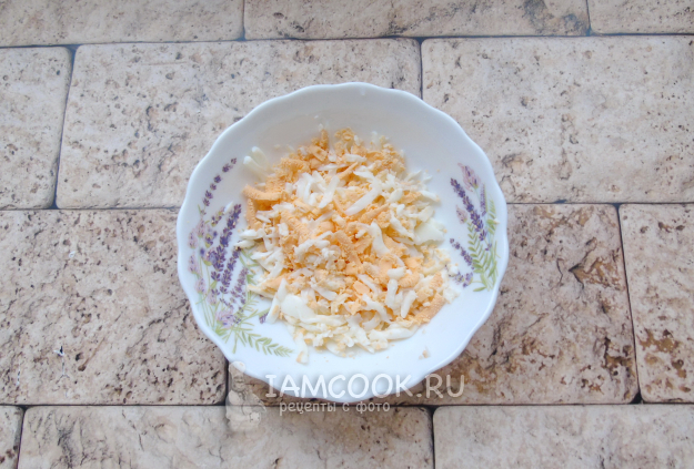 Приготовьте начинку для лодочек. Яйца сварите вкрутую: выложите сырые яйца в кастрюлю, залейте водой и варите 10 минут с момента закипания. После достаньте из кастрюли, обдайте холодной водой, очистите и натрите на терке.