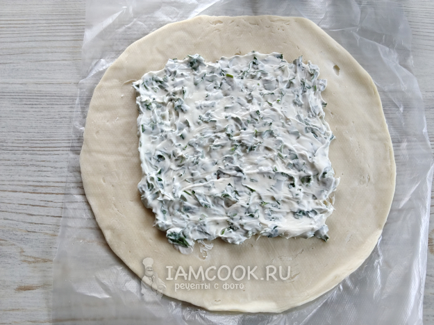Распределить по центру лепешки сырную начинку.