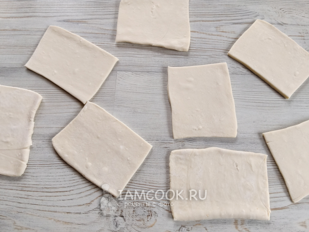 Тесто раскатать, нарезать на квадраты.