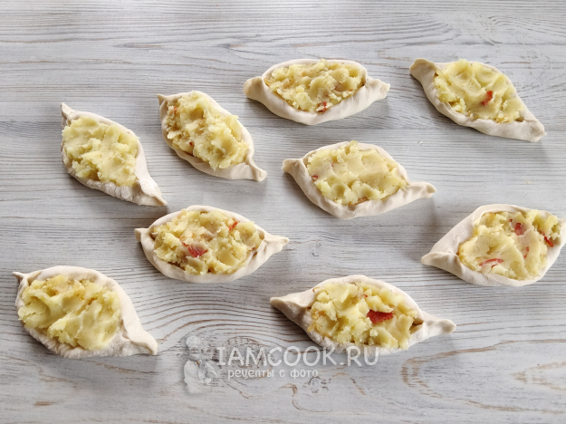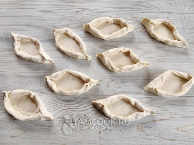 Подвернуть тесто с краев и хорошенько защипнуть кончики с обеих сторон, чтобы получились лодочки.