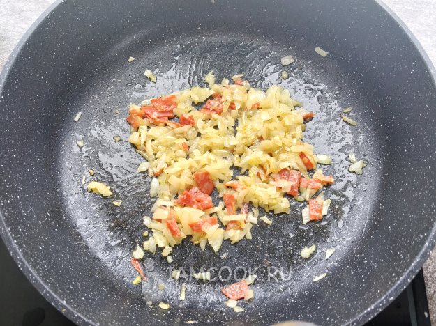 Лук мелко нарезать, обжарить на сливочном масле до мягкости. Добавить в конце нарезанную колбасу.