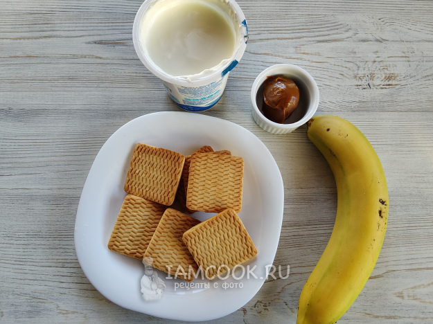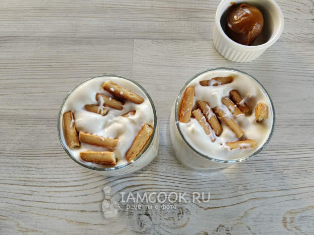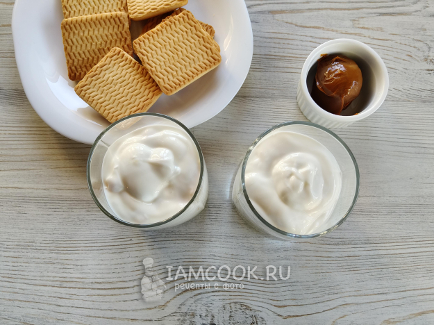 Печенье разломать на 2-3 части, поместить в стакан с йогуртом, так, чтобы он попадал на каждый кусочек.