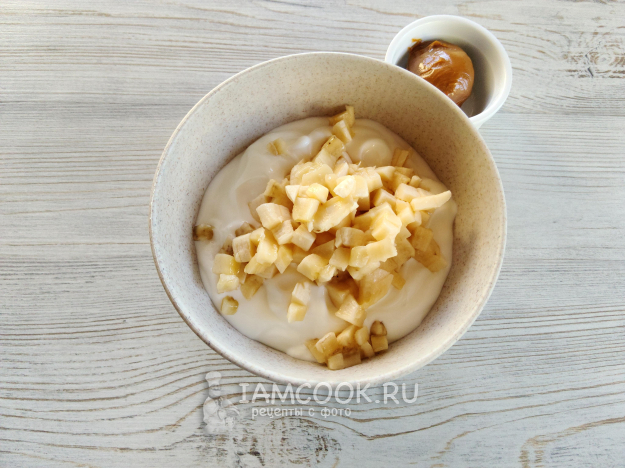 В йогурт нарезать мелко банан.