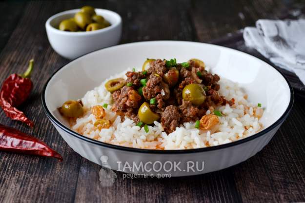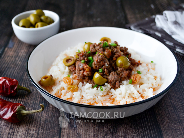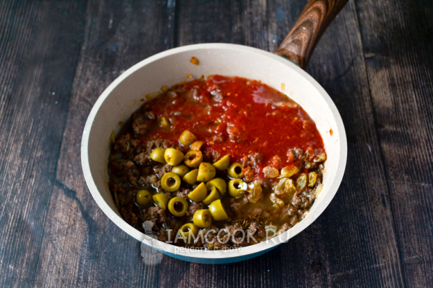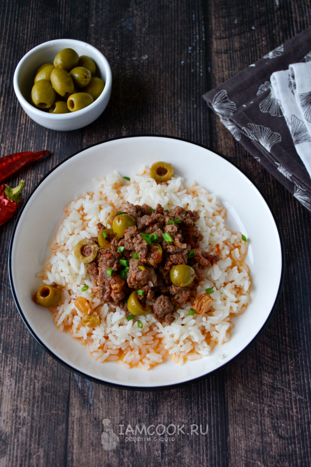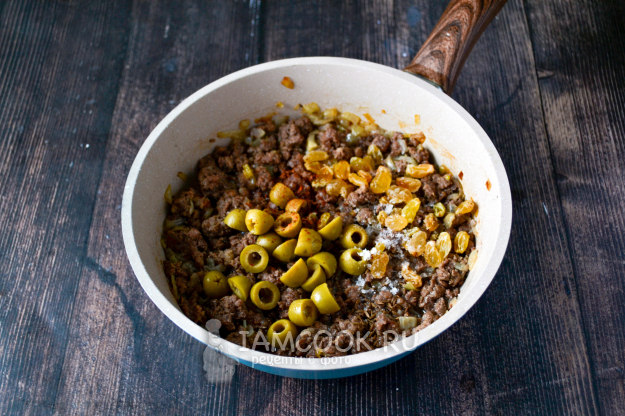 Положите в почти готовый фарш нарезанные оливки, промытый изюм, красный острый перец, тмин. Перемешайте, попробуйте на соль, досолите по вкусу.