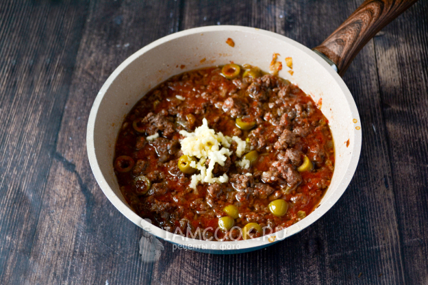 В конце тушения добавьте пропущенный через пресс чеснок, перемешайте, прогрейте блюдо еще 2-3 минуты и снимайте с огня. Кстати, такой обжаренный со специями фарш можно использовать для приготовления энчилады.