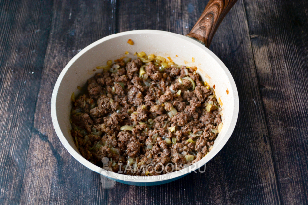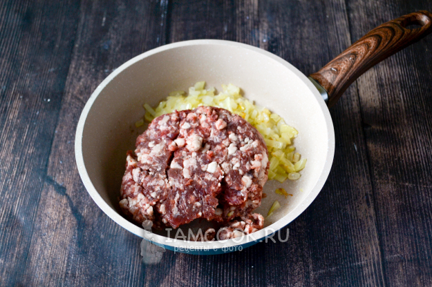Сдвиньте лук на сковороде в сторону, положите на освободившееся место говяжий фарш.