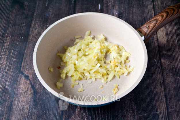 Лук почистите, нарежьте мелким кубиком и обжарьте на растительном масле до легкого золотистого цвета.